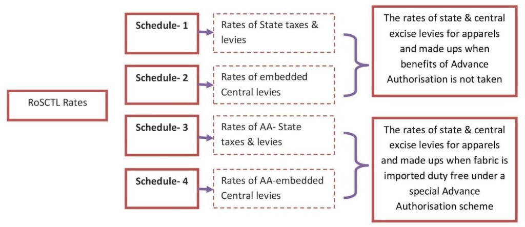 As per Notification No. 14/26/2016-IT (Vol.II) dated 07.03.2019, the RoSCTL rates have been notified as schedule 1, 2, 3 & 4 as follows:- Schedule 1 & 2 – The rates of state & central excise Levies for apparels and made-ups. Schedule 3 & 4 – The State & central excise Levies rates for apparels export when the fabric is imported duty-free under a special Advance authorization scheme.The RoSCTL Rates are given as follows:-